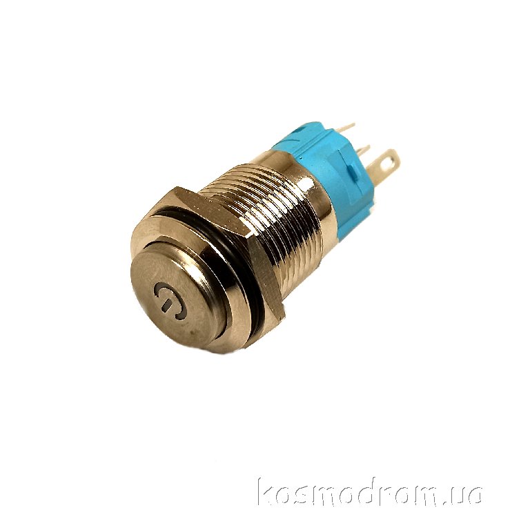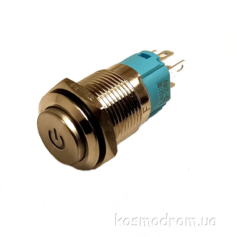 LB12E-P10Z-EDYB5-24V-N Кнопка антивандальная круглая, 12 мм, плоская, нормально открытая, С ФИКСАЦИЕЙ, символ ON/OFF + круговая LED, BLUE, 5-24V, латунь никелированная, MAX: 7A/250VAC
