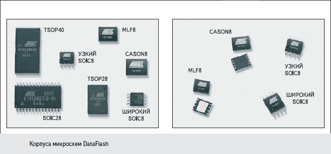 Микросхемы DataFlash выпускаются с диапазоном питающих напряжений 2,7-3,6 В. На данный момент микросхемы выпускаются в различных корпусных исполнениях. При разработке новых проектов следует учитывать, что производитель планирует в ближайшем будущем снять с производства корпуса с большим количеством выводов (SOIC28, TSOP, CBGA) и свести весь ассортимент корпусов микросхем к двум видам - широкий (209 ml) или узкий (150 ml) 8-выводный SOIC (выводы наружу), и 8-выводный MLF (6Y8 мм) или CASON (6Y5 мм) (выводы под корпусом). В "широком" SOIC будут выпускаться микросхемы емкостью от 1 до 128 Мбит, а в "узком" SOIC - микросхемы емкостью от 1 до 32 Мбит, что позволит в случае необходимости легко заменить в текущем проекте имеющуюся микросхему на микросхему с другим объемом памяти, не меняя разводку на плате. Причем "узкий" SOIC и MLF, а также "широкий" SOIC и CASON совместимы по геометрическому расположению выводов, то есть одну микросхему можно поменять на другую без изменения разводки на плате.