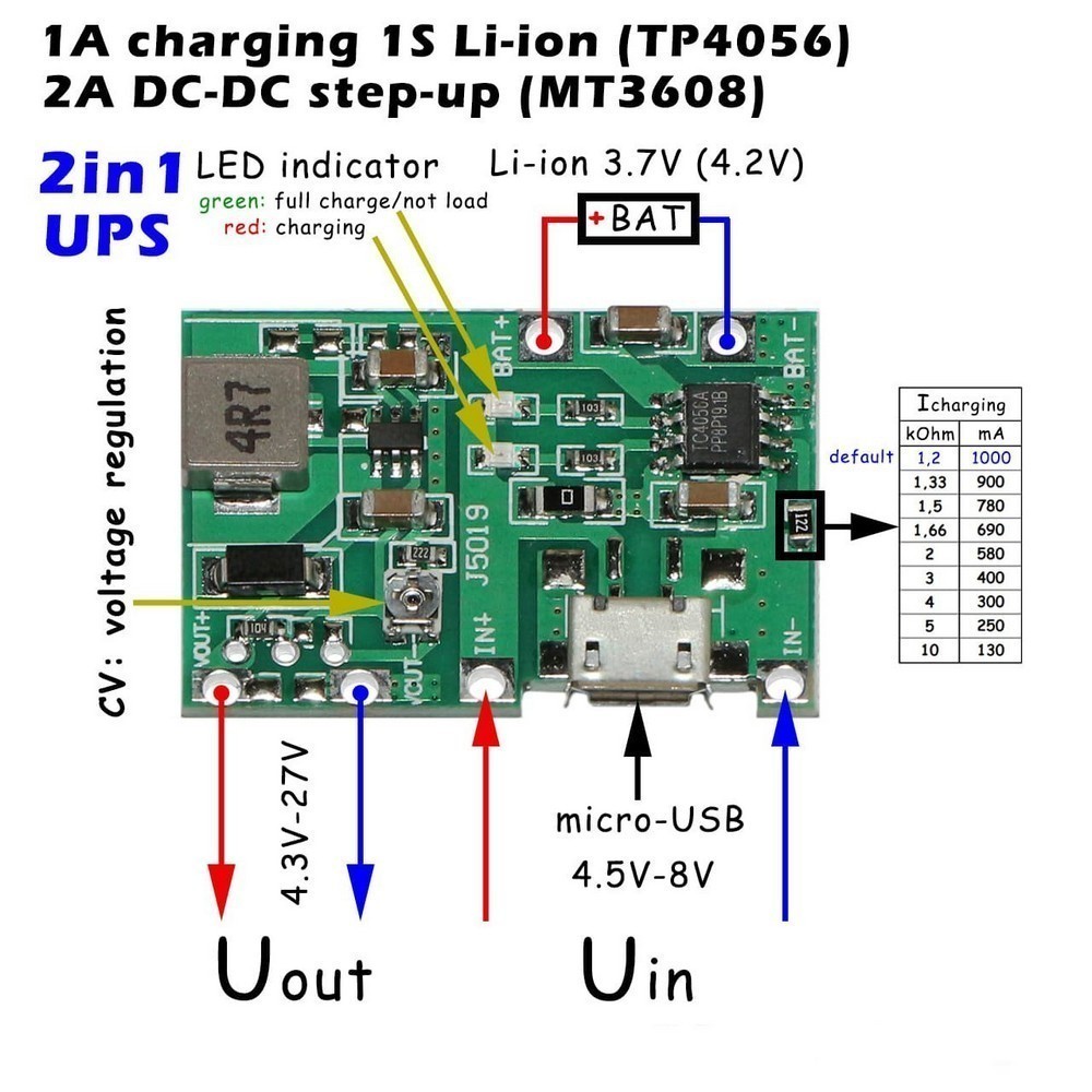 | J5019-Modul Модуль контроля заряда аккумулятора Зарядно-повышающий модуль 1A/2A ИБП-функция DC-DC 2A CV 4.3-27V