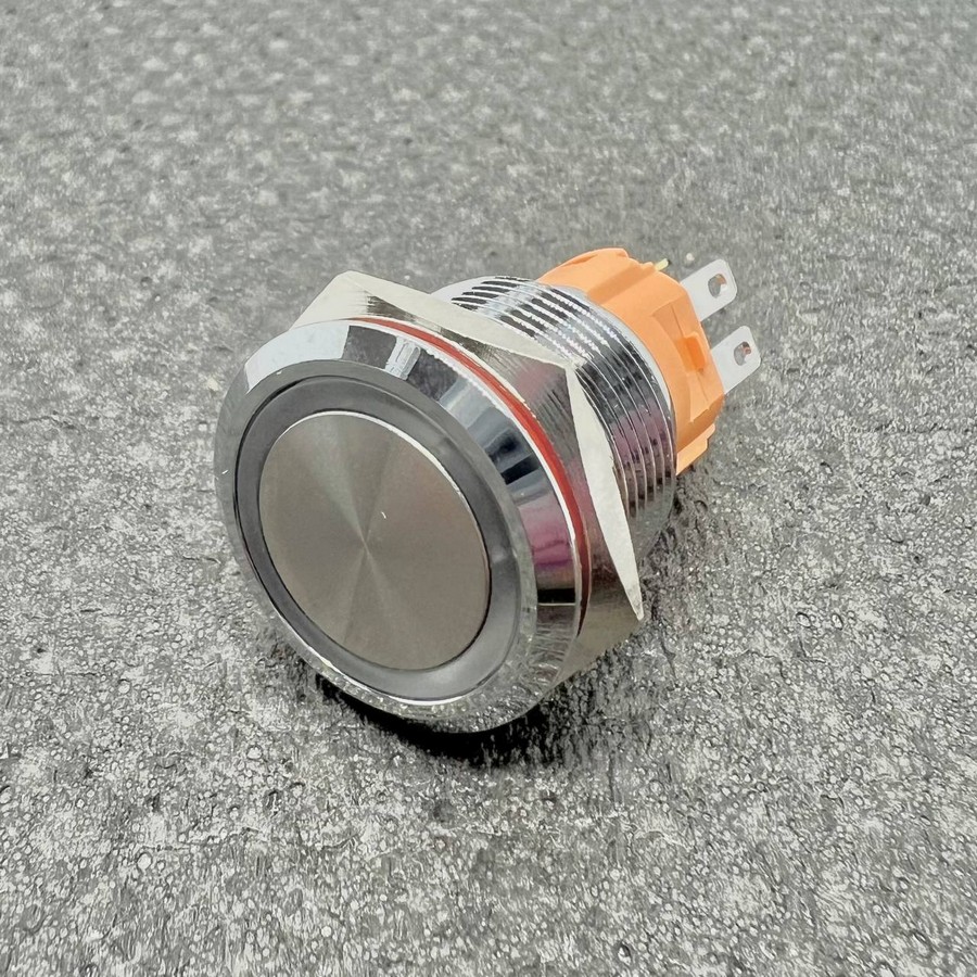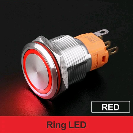 | LB19A-P11Z-ER9-24V-N Кнопка антивандальная плоская, нормально открытая, D=19 мм, С ФИКСАЦИЕЙ, круговая LED, RED, 9-24V, латунь никелированная, круглая