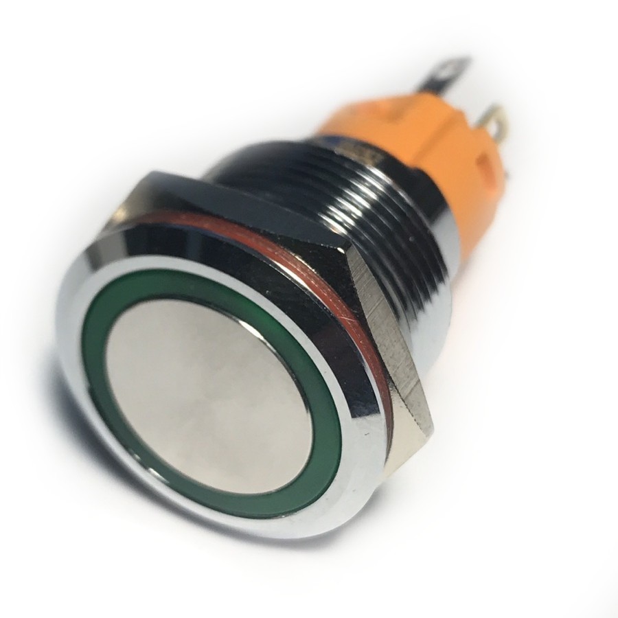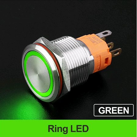 | LB19A-P11Z-EG9-24V-N Кнопка антивандальная плоская, нормально открытая, D=19 мм, С ФИКСАЦИЕЙ, круговая LED, GREEN, 9-24V, латунь никелированная, круглая