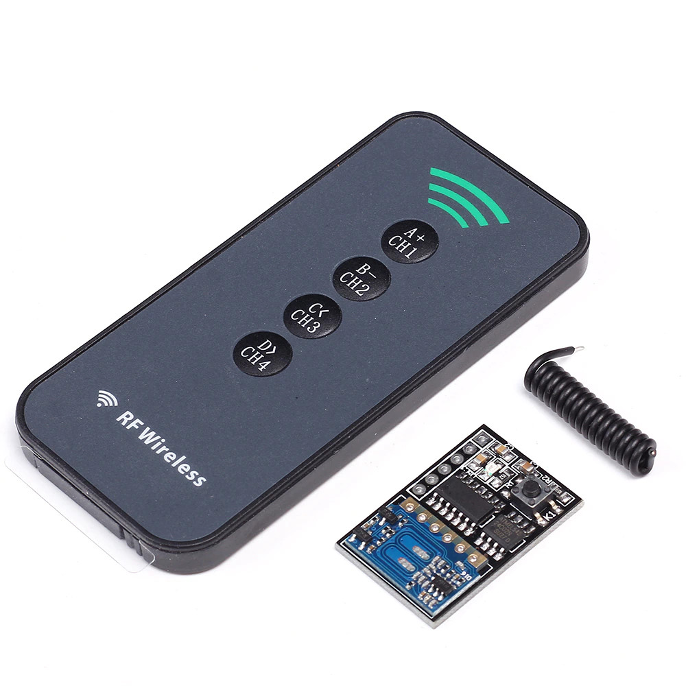| RF: Remote Control + Receiver Module Электронный набор Беспроводной приемный модуль, 4-кнопочный пульт дистанционного управления + исполнительный модуль 433 МГц, 4-канальный выход 4,5-5,5 В, 3 мА, дальность 15-50 м