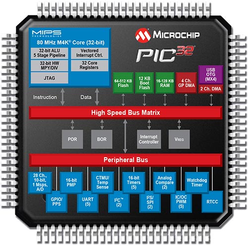 PIC32MX3/4 (MCU) в конфигурациях 64/16 КБ, 256/64 КБ и 512/128 КБ
