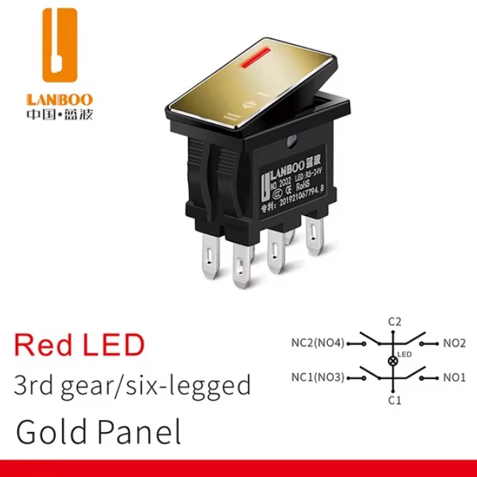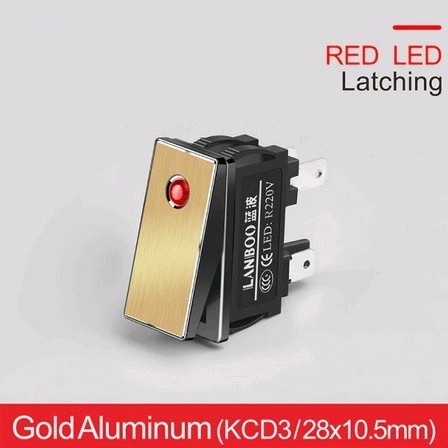 | LB2810.5-5-24V-2NO-Red-Gold Микропереключатель рокерный Клавишный переключатель, с фиксацией, 28.4x10.5мм, питание подсветки 5-24 В, красный, панель золотистая, нагрузка 20A/250VAC