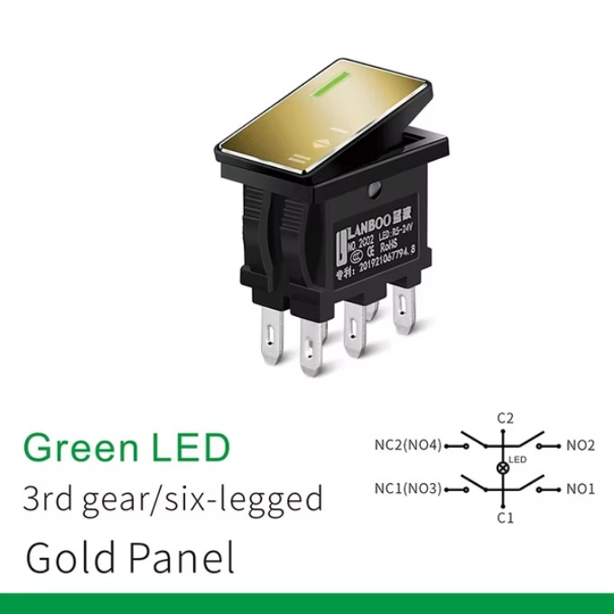 | LB2810.5-5-24V-2NO-Green-Gold Микропереключатель рокерный Клавишный переключатель, с фиксацией, 28.4x10.5мм, питание подсветки 5-24 В, зеленый, панель золотистая, нагрузка 20A/250VAC