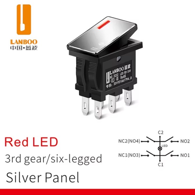 | LB2810.5-5-24V-2NO-Red-Silver Микропереключатель рокерный Клавишный переключатель, с фиксацией, 28.4x10.5мм, питание подсветки 5-24 В, красный, панель серебро, нагрузка 20A/250VAC