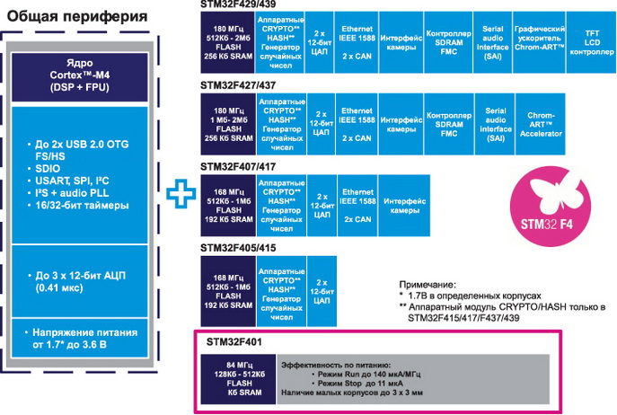 Линейка STM32F405/415 является базовой для всего семейства. Максимальная