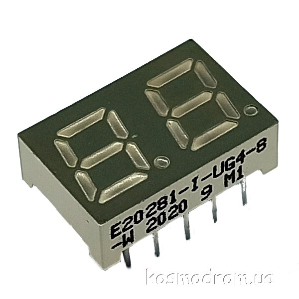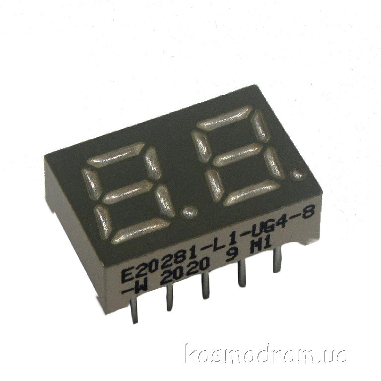 E20281-L-UG4-8-W Светодиодный индикатор двухсимвольный Светодиодный индикатор, общий катод, высота символа 7,11 мм, двухсимвольный, цвет свечения зеленый. Динамическая индикация
