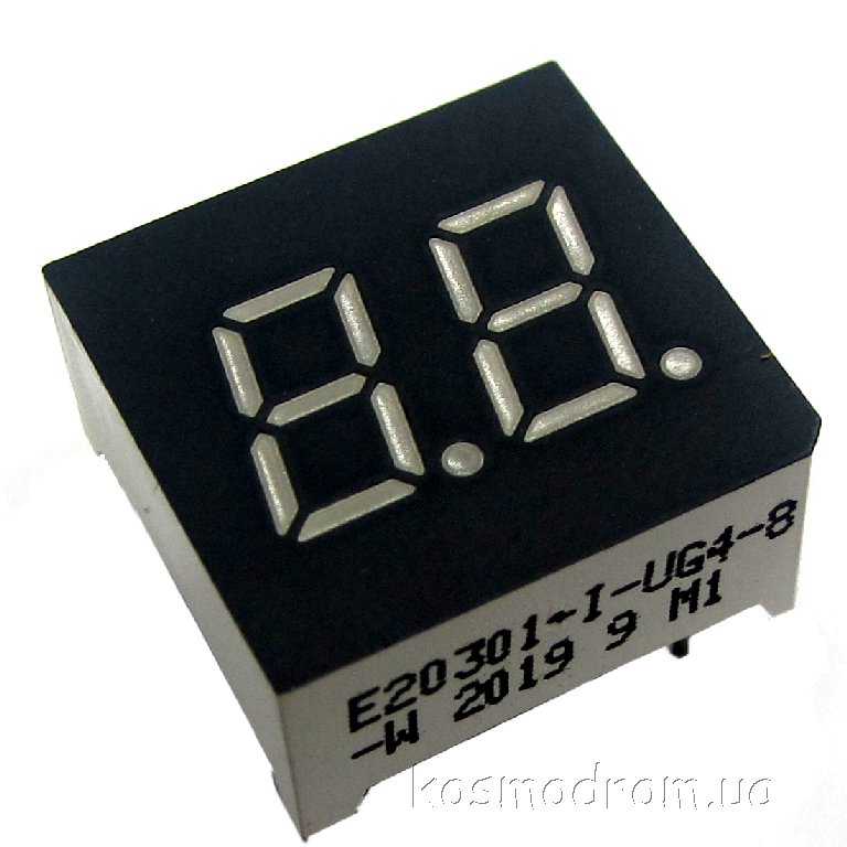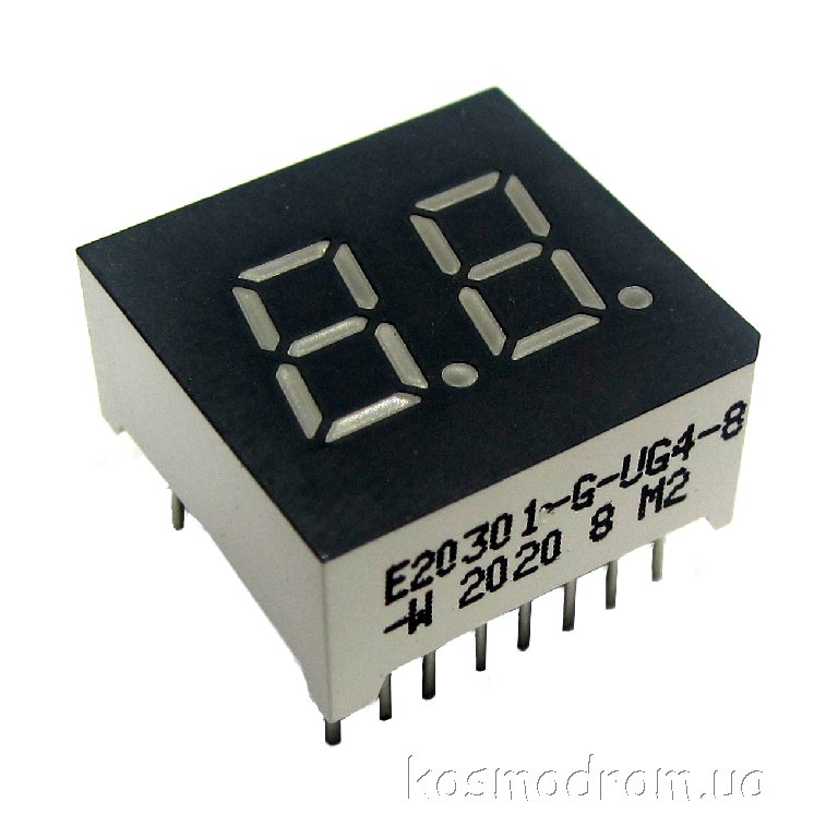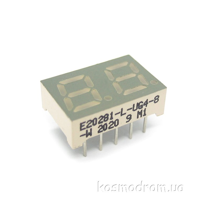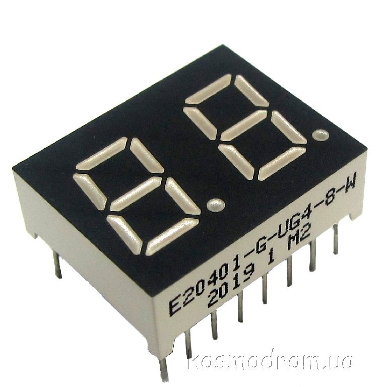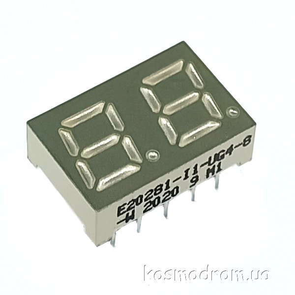 E20301-L-UG4-8-W Светодиодный индикатор двухсимвольный Светодиодный индикатор, общий катод, высота символа 7,62 мм, двухсимвольный, цвет свечения зеленый. Динамическая индикация