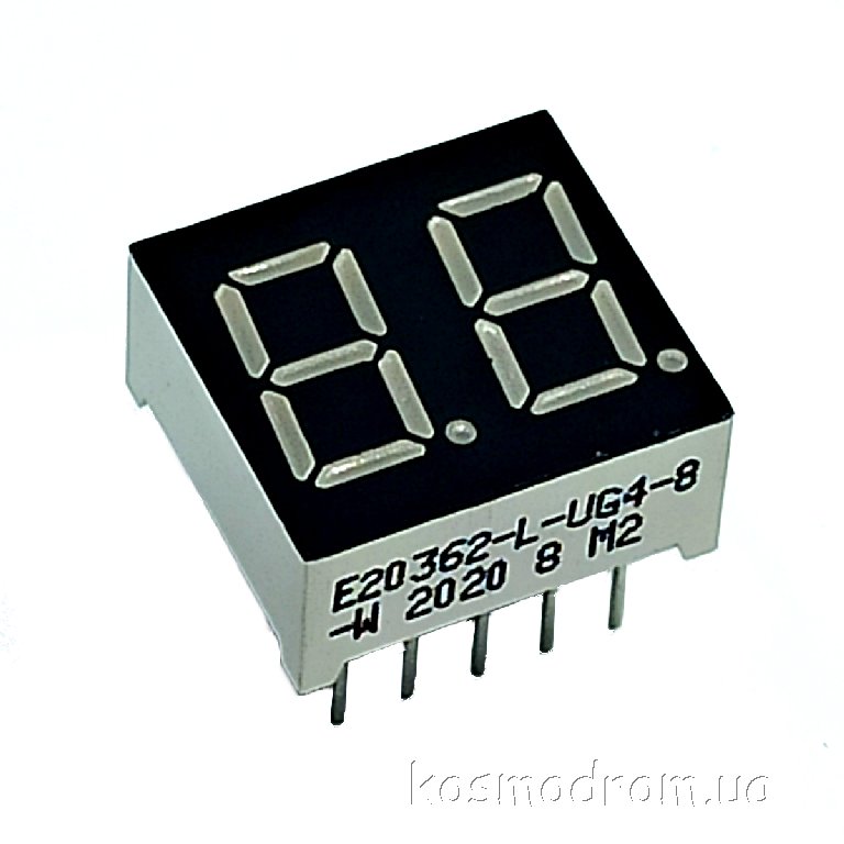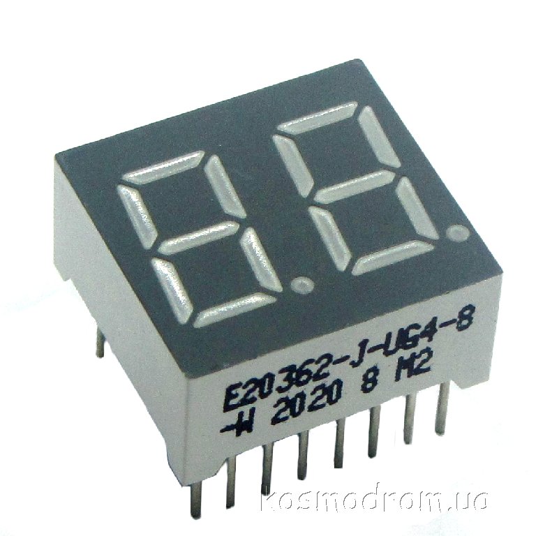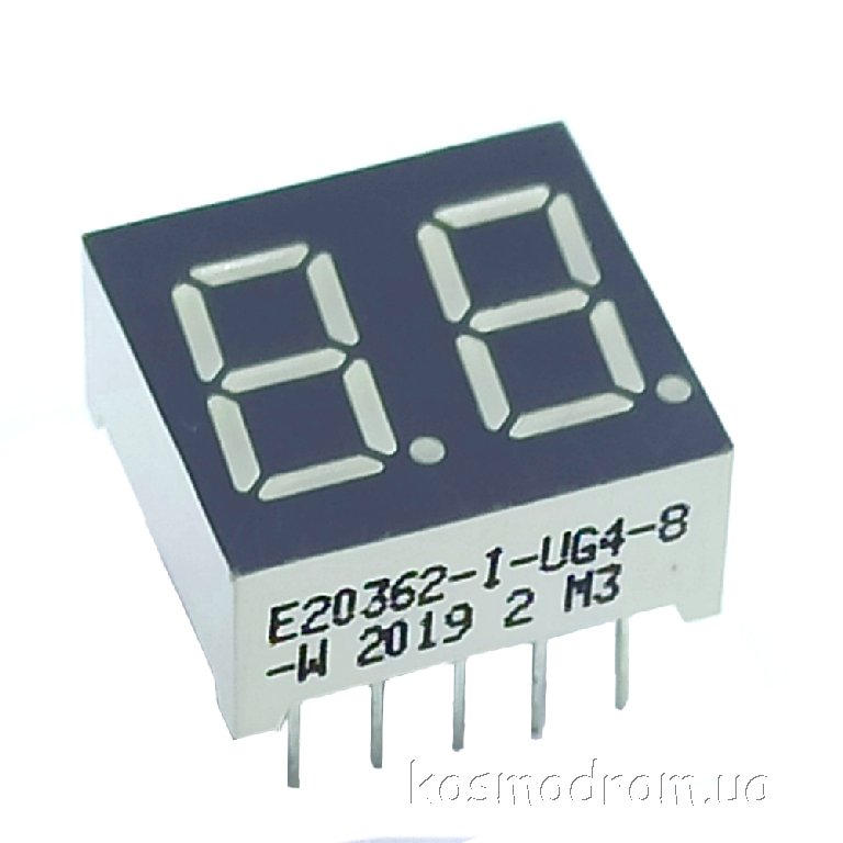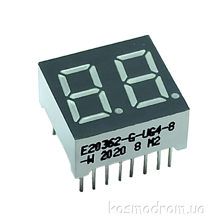 E20362-L-UG4-8-W Светодиодный индикатор двухсимвольный Светодиодный индикатор, общий катод, высота символа 9,14 мм, двухсимвольный, цвет свечения зеленый. Динамическая индикация