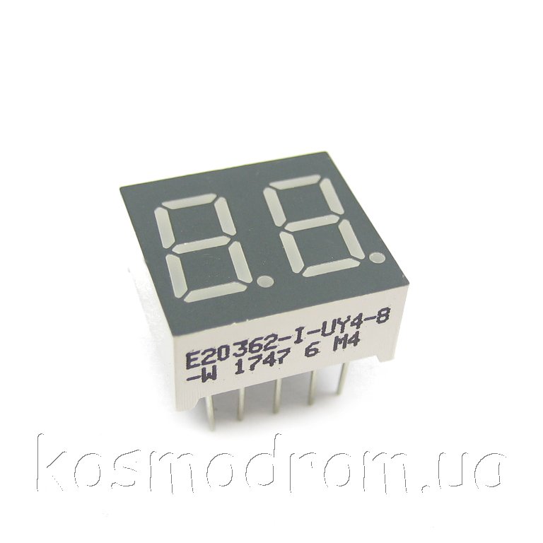 E20362-I-UY4-8-W Светодиодный индикатор двухсимвольный Светодиодный индикатор двухсимвольный, общий анод, высота символа 9,14 мм, цвет свечения желтый яркий, серый фон. Динамическая индикация