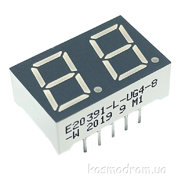 E20391-L-UG4-8-W Светодиодный индикатор двухсимвольный Светодиодный индикатор, общий катод, высота символа 9,91 мм, двухсимвольный, цвет свечения зеленый. Динамическая индикация