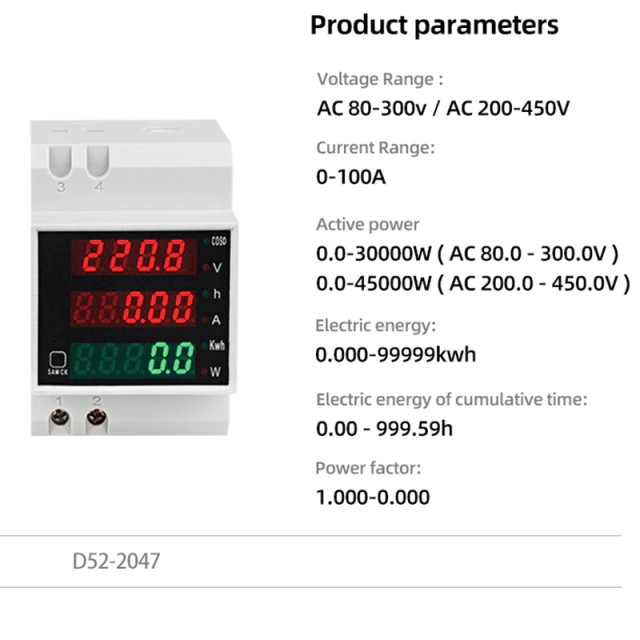 | D52-2047 Вольтметр Ваттметр D52-2047 на дин рейку AC 80-300 V,0-100 A с встроенным трансформатором тока