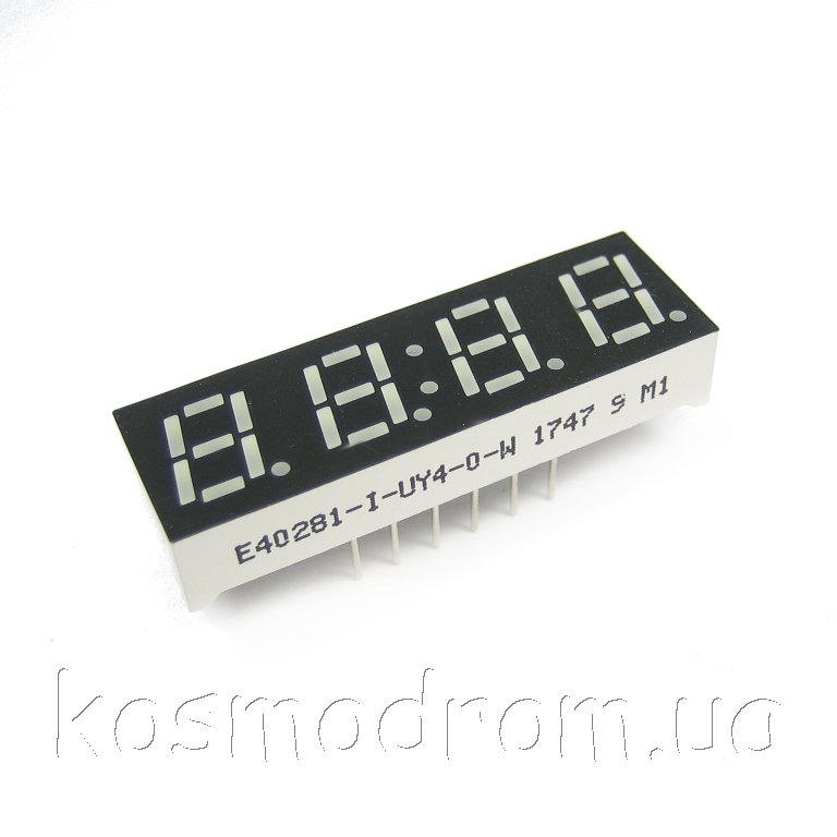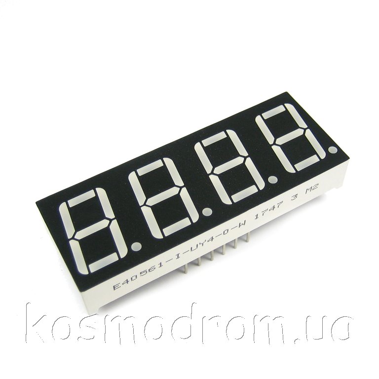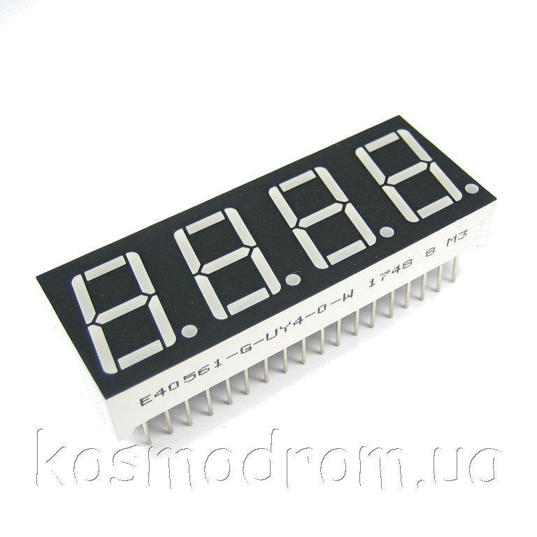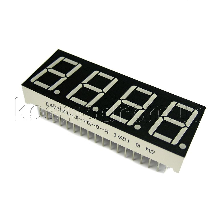 E40561-I-UY4-0-W Светодиодный индикатор четырехсимвольный Светодиодный индикатор, общий анод, высота символа 14,22 мм, четырехсимвольный, цвет свечения желтый яркий, черный фон. Динамическая индикация
