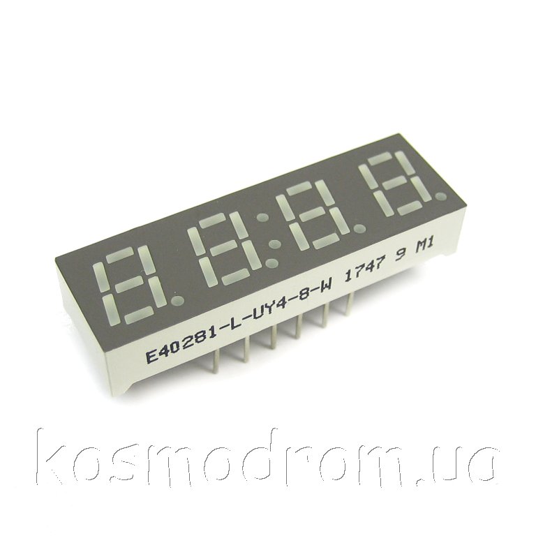 E40281-L-UY4-8-W Светодиодный индикатор четырехсимвольный Светодиодный индикатор, общий КАТОД, высота символа 7,11 мм, четырехсимвольный, цвет свечения желтый яркий. фон серый. Динамическая индикация