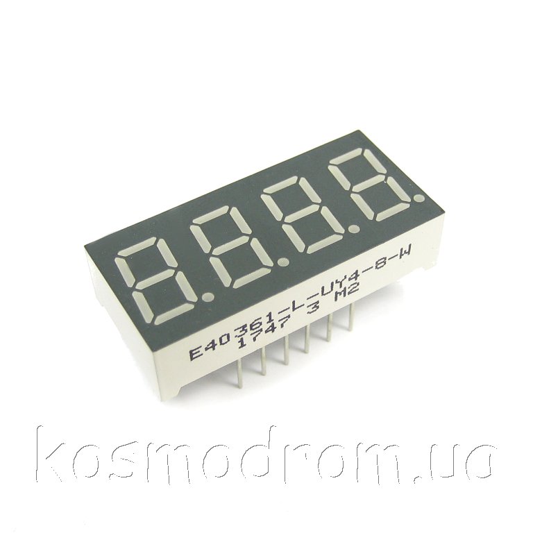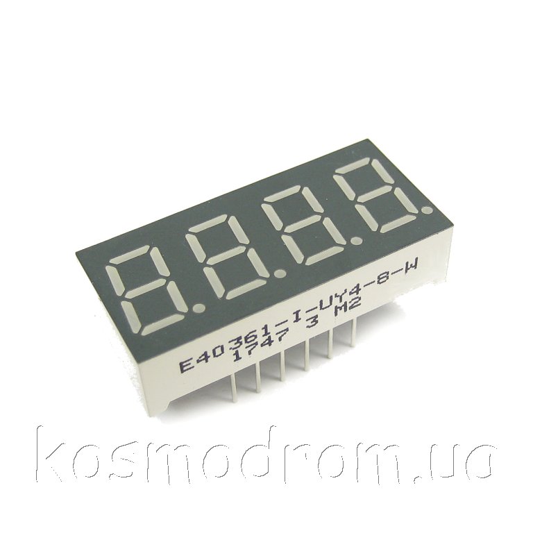E40361-L-UY4-8-W Светодиодный индикатор четырехсимвольный Светодиодный индикатор, общий КАТОД, высота символа 9,14 мм, четырехсимвольный, цвет свечения желтый яркий. фон серый. Динамическая индикация