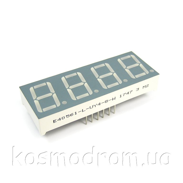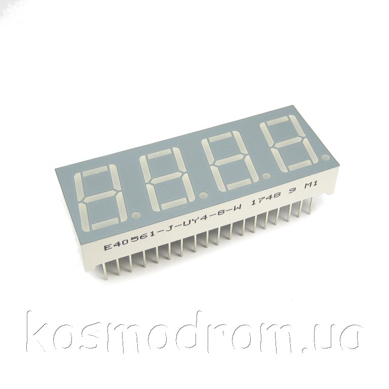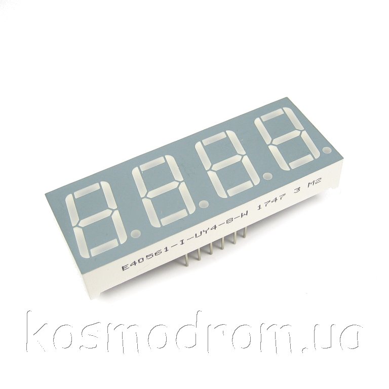 E40561-I-UY4-8-W Светодиодный индикатор четырехсимвольный Светодиодный индикатор, общий анод, высота символа 14,22 мм, четырехсимвольный, цвет свечения желтый яркий, серый фон. Динамическая индикация