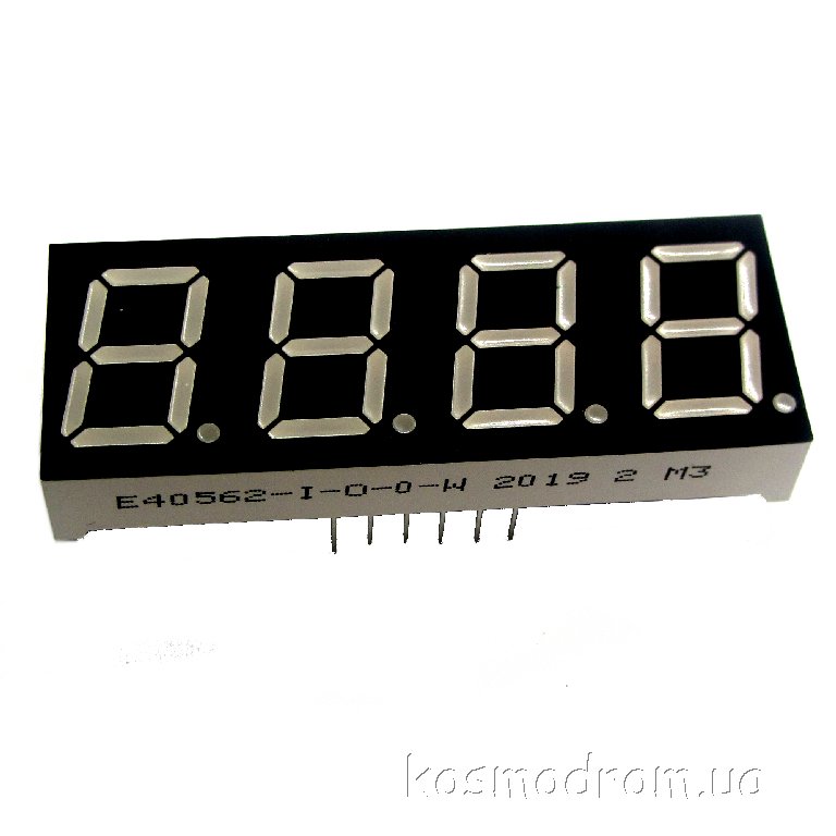 E40562-L-K-0-W Светодиодный индикатор четырехсимвольный Светодиодный индикатор, общий КАТОД, высота символа 14,22 мм, четырехсимвольный, цвет свечения зеленый. фон черный. Динамическая индикация