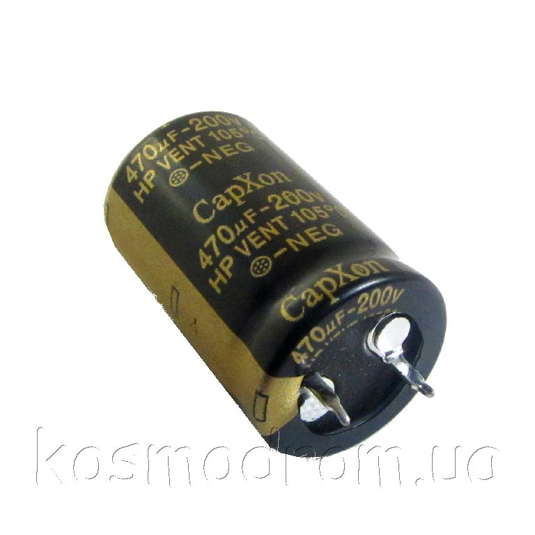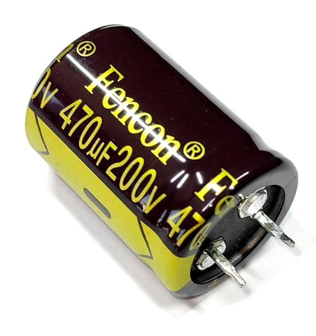 Конденсатор электролитический: 470 мкФ, 200 В. Диаметр 25 мм. Высота 35 мм.