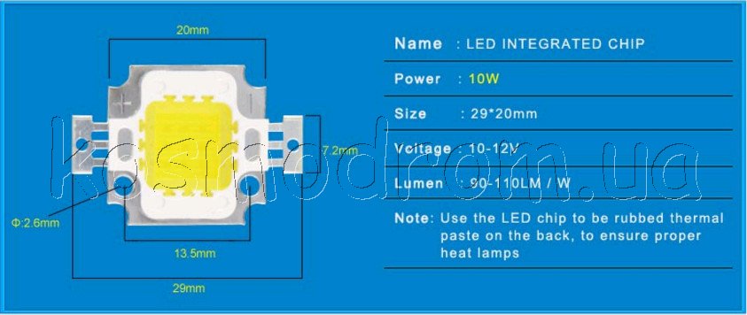 | ARPL-10W-6000K Светодиод мощный Светодиод мощный до 10 Ватт, световой поток до 1100 Лм, ХОЛОДНЫЙ-БЕЛЫЙ, 6200 К. 22..38 В, ток до 280...300 мА.