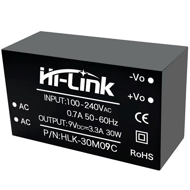 | HLK-30M09 Модульный сетевой источник питания на плату Мощность: 30 Вт. Входное напряжение: 220В. Выходное напряжение: 9V. Вых. ток: 3300mA