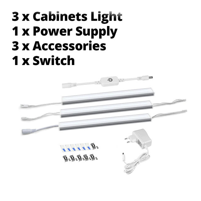 3xLamp-Touch-White-30 Светодиодные линейки для подсветки интерьера Набор для подсветки: три лампы + источник питания, сенсорное включение (регулировка яркости), холодный-белый, 30 см