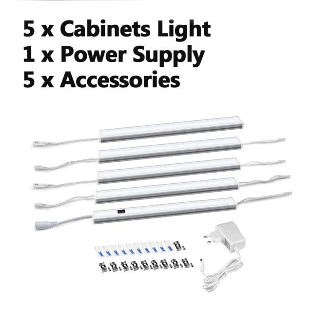 5xLamp-Touch-White-30 Светодиодные линейки для подсветки интерьера Набор для подсветки: пять ламп + источник питания, сенсорное включение (регулировка яркости), холодный-белый, 30 см