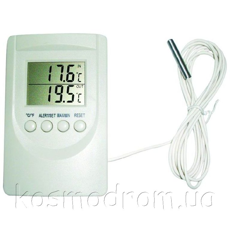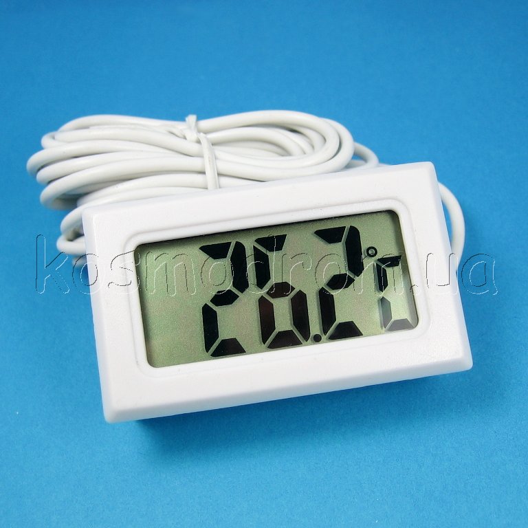 | TMP-10-Digital-Thermometr-White Измеритель температуры Универсальный цифровой термометр с выносным датчиком и малыми габаритными размерами, диапазон измерения -50...110 С. Корпус: белый. БЕЗ БАТАРЕЕК.