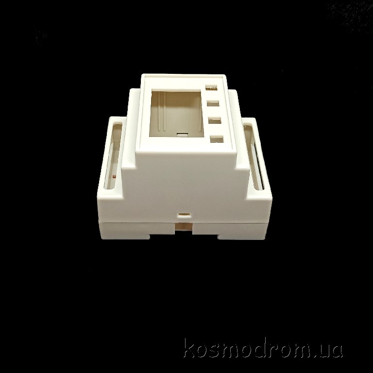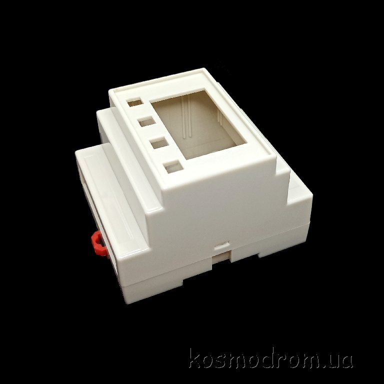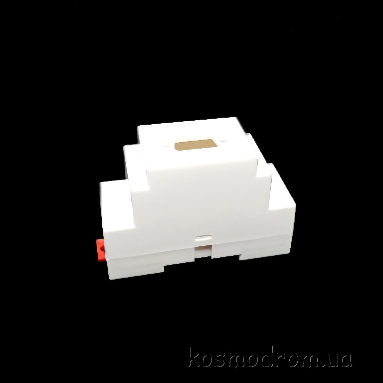 Пластиковый корпус на DIN рейку светло серого цвета, из ABS пластика. Габаритные размеры составляют: по длине 37мм, по ширине 88мм и по высоте 59мм.