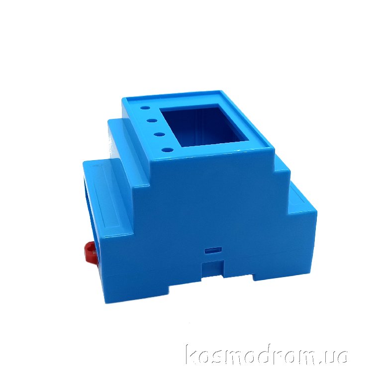 Пластиковый корпус на DIN рейку синего цвета.Из ABS пластика. Габаритные размеры составляют: по длине 72 мм, по ширине 88 мм и по высоте 59 мм. С отверстиями под экран и кнопки