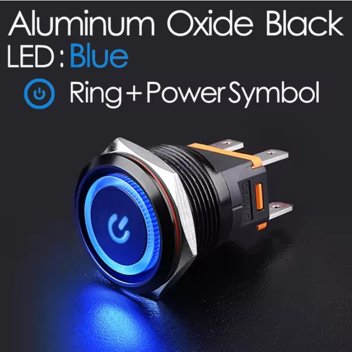 | LB22C-P20F/EDYB9-24V/A(L) Кнопка антивандальная D=22mm, 2NO, Aluminum oxide BLACK плоская, нормально открытая, БЕЗ ФИКСАЦИИ, круговая+символ ON/OFF LED BLUE(синий), High-Current, MAX: 15A/250VAC