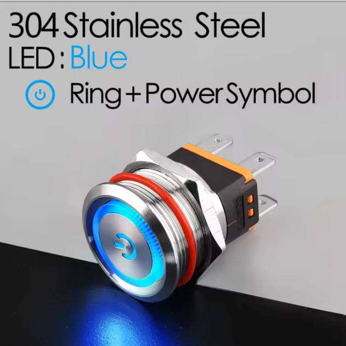 | LB22C-P20F/EDYB9-24V/S(L) Кнопка антивандальная D=22mm, 2NO, плоская, нормально открытая, БЕЗ ФИКСАЦИИ, круговая+символ ON/OFF LED BLUE(синий), High-Current, MAX: 15A/250VAC