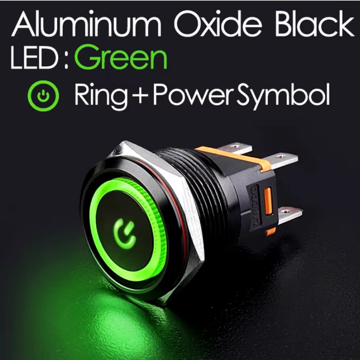 | LB22C-P20Z/EDYG9-24V/A(L) Кнопка антивандальная D=22mm, 2NO, Aluminum oxide BLACK плоская, нормально открытая, С ФИКСАЦИИ, круговая+символ ON/OFF LED GREEN(зеленый), High-Current, MAX: 15A/250VAC