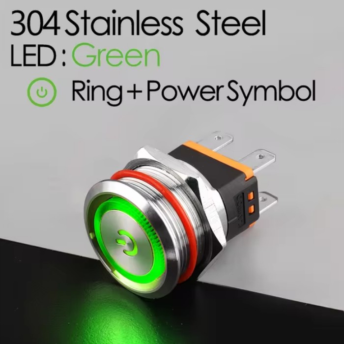| LB22C-P20F/EDYG9-24V/S(L) Кнопка антивандальная D=22mm, 2NO, плоская, нормально открытая, БЕЗ ФИКСАЦИИ, круговая+символ ON/OFF LED GREEN(зеленый), High-Current, MAX: 15A/250VAC