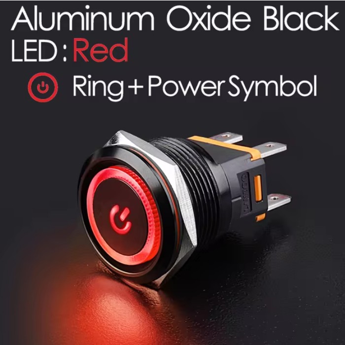 | LB22C-P20Z/EDYR9-24V/A(L) Кнопка антивандальная D=22mm, 2NO, Aluminum oxide BLACK плоская, нормально открытая, С ФИКСАЦИИ, круговая+символ ON/OFF LED RED(красная), High-Current, MAX: 15A/250VAC