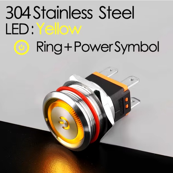 | LB22C-P20F/EDYY9-24V/S(L) Кнопка антивандальная D=22mm, 2NO, плоская, нормально открытая, БЕЗ ФИКСАЦИИ, круговая+символ ON/OFF LED YELLOW(желтый), High-Current, MAX: 15A/250VAC