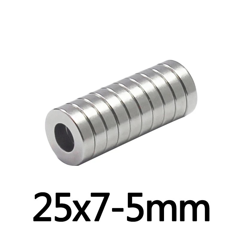 | Magnet-25X7-5 Магнит Магнит неодимовый, шайба с отверстием, диаметр 25 мм. Высота: 7 мм (+/- 0,5). Диаметр отверстия: 5 мм. N35. Напр. магн. поля: Аксиальное. Возможны незначительные сколы без повреждения структуры магнита
