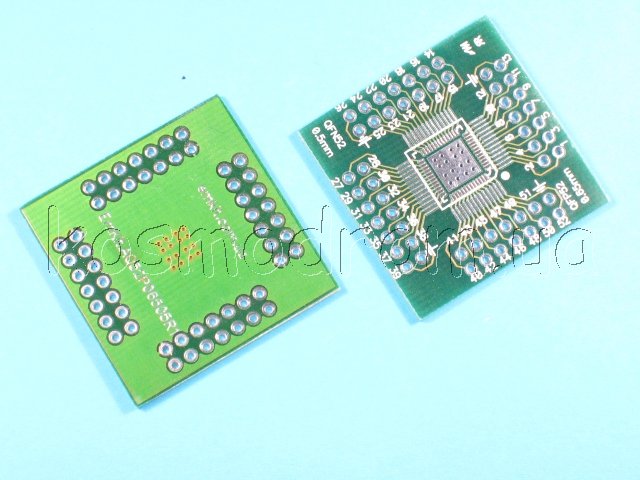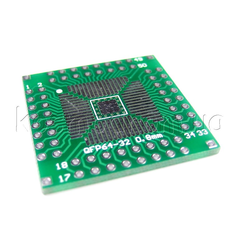 | MAKET-PCB-QFP32-100-0.5-0.8 Макетная плата - адаптер Универсальная макетная плата. Двухсторонняя, для корпусов QFP TQFP LQFP FQFP от 32 до 100 / 32 - 64 выводов с шагом 0,5 и 0,8 мм.