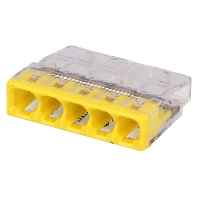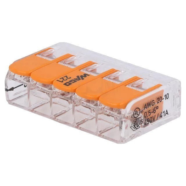 | 221-415 Клемма строительно-монтажная Соединитель: клеммник монтажный, самозажимная клемма, 0,2 - 4мм2. Количество клемм: 5