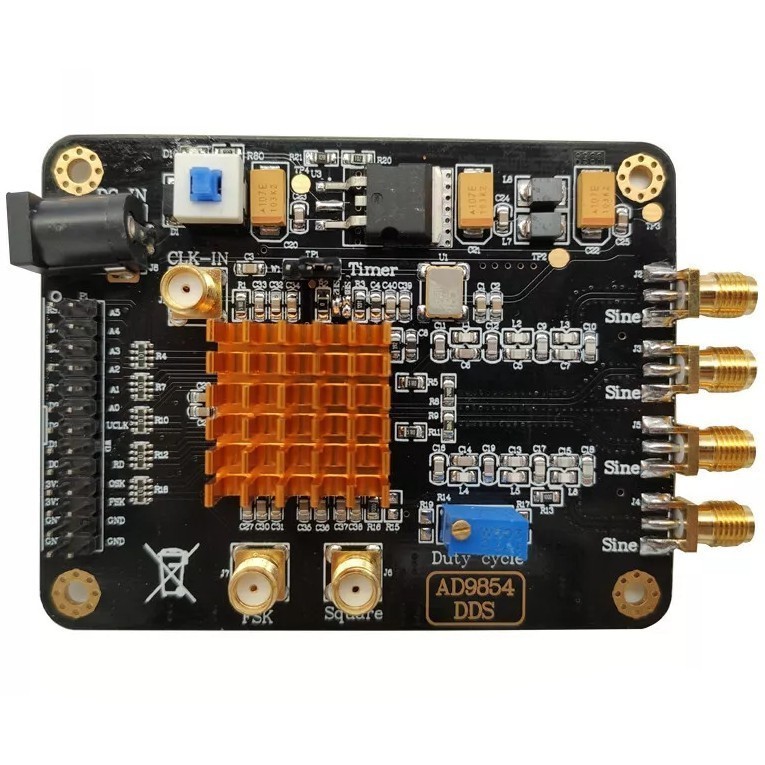 цифровой синтезатор частоты до 120 МГц, с синусоидальными и квадратными выходами. Питание 5-9 В, потребление до 650 мА.