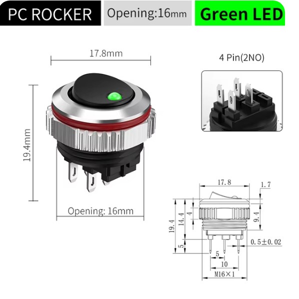 | CX16-H222/G5-24V/S(L) Микропереключатель рокерный Переключатель металлический, 2NO2NC, клавиша Black, диаметр 16 мм, питание 5-24В, с фиксацией, цвет индикации: GREEN/зеленый