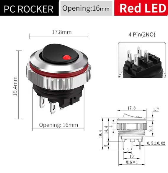 | CX16-H222/R5-24V/S(L) Микропереключатель рокерный Переключатель металлический, 2NO2NC, клавиша Black, диаметр 16 мм, питание 5-24В, с фиксацией, цвет индикации: RED/красный