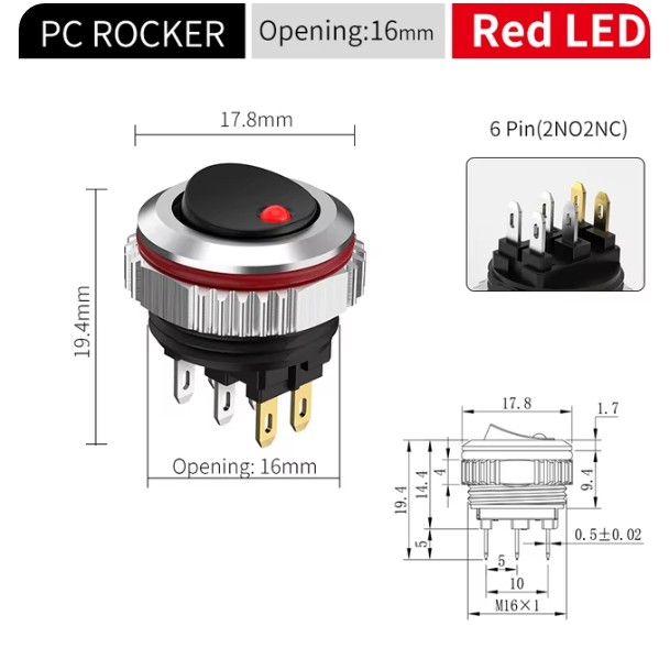 | CX16-H202/R5-24V/S(L) Микропереключатель рокерный Переключатель металлический, 2NO, клавиша Black, диаметр 16 мм, питание 5-24В, с фиксацией, цвет индикации: RED/красный
