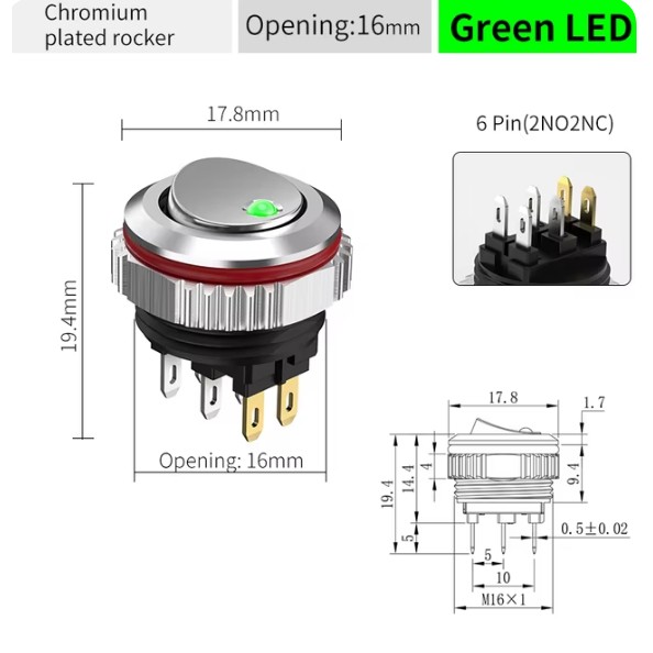 | CX16-H202/G5-24V/S(L) Микропереключатель рокерный Переключатель металлический, 2NO, клавиша Black, диаметр 16 мм, питание 5-24В, с фиксацией, цвет индикации: GREEN/зеленый