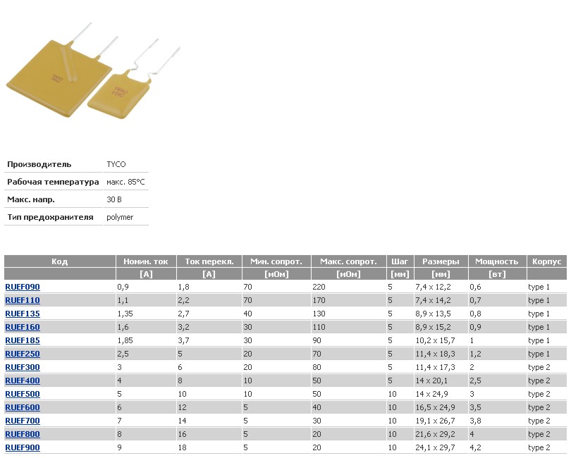 полимерных предохранителей PTC типа