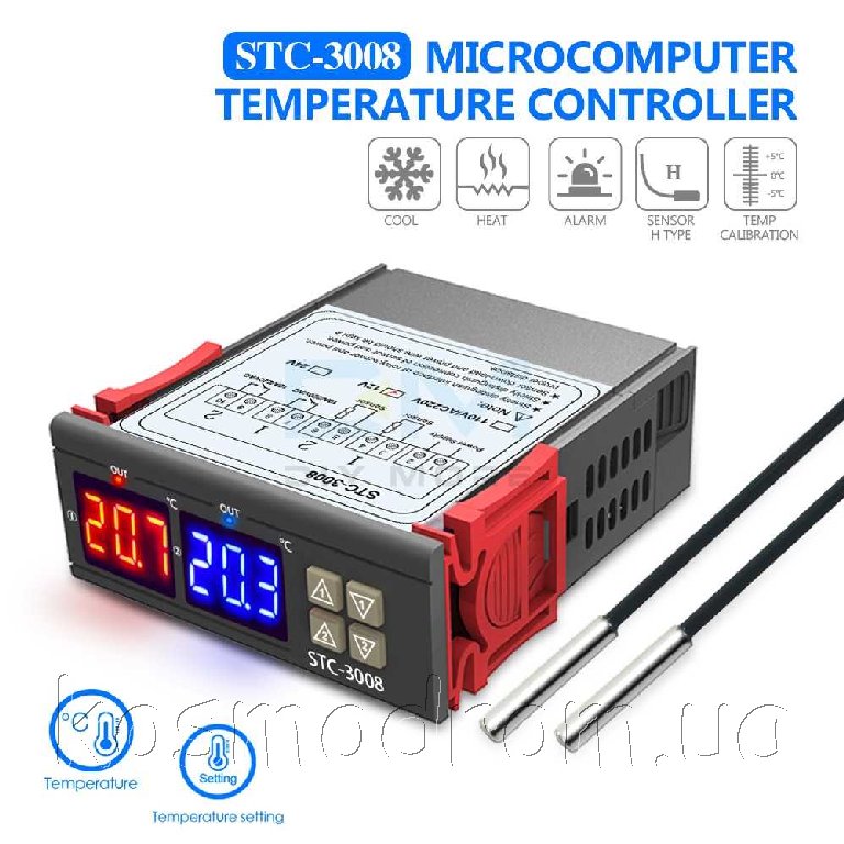 | STC-3008-12V Терморегулятор Двойной цифровой терморегулятор: 10 А. -55...+120? пит: 12VDC. Нагрев/Охлаждение