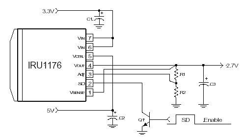 IRU1176 – 7.5А стабилизатор с очень малым падением напряжения, выполненный по биполярной технологии, который достигает сопоставимых характеристик по сопротивлению открытого канала дискретного МОП-транзистора. IRU1176 имеет удобный вход выключения, который позволяет выключить стабилизатор и уменьшить потребление входного тока.