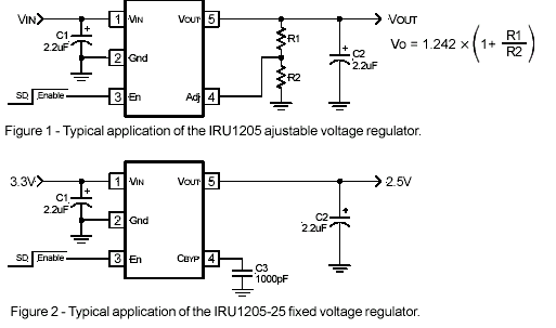 IRU1205 доступен в различных исполнениях: с фиксированными выходными напряжениями и с регулируемым в малогабаритном корпусе SOT23-5. | |