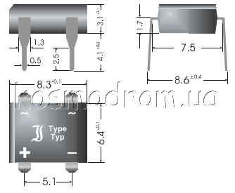 | B8S Мост однофазный выпрямительный Мост однофазный SMD: 0.5 А, 800 В. -65…150°C