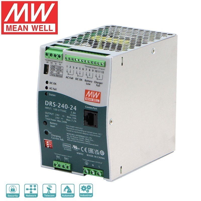 | DRS-240-24 Модульный источник питания на DIN-рейку Умный ИП совмещённый с контроллером аккумулятора системы бесперебойного питания на DIN-рейку. Uвых=24В DC/10А. AC/DC, 240W, Вход: 90-305VAC/127-431VDC, Выход: 24V/10A, размеры 85.5x125.2x129.2 мм, -30...+70 С